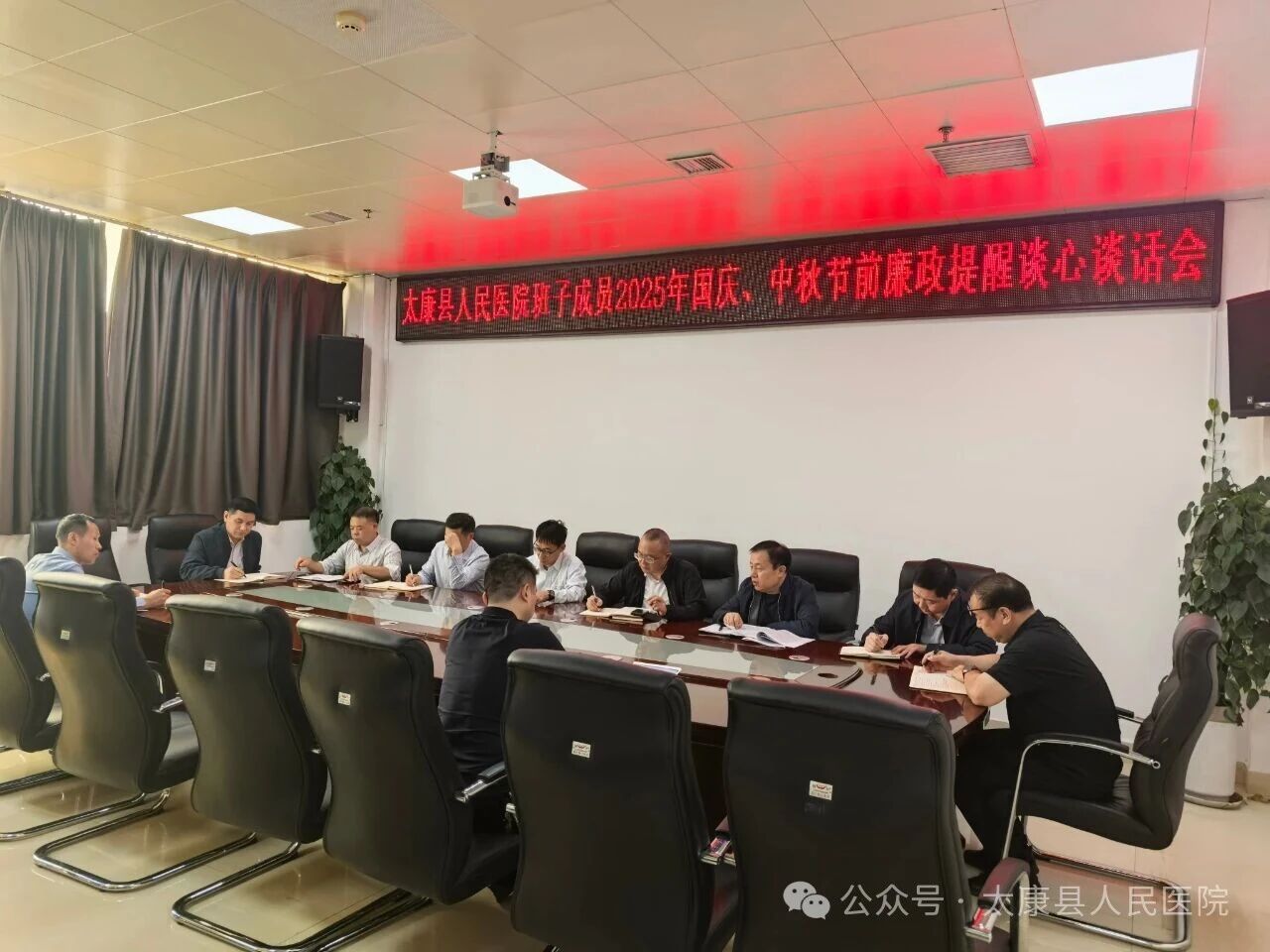 医院在小会议室率先召开班子成员2025年国庆、中秋节前廉政提醒谈心谈话会。太康县纪委监委派驻卫健委纪检监察组组长邱红卫强调,医院班子成员要充分发挥"头雁效应",带头遵守廉洁自律各项规定,严格落实"一岗双责",既要管好自己,又要带好队伍,为全院干部职工立标杆、作表率。