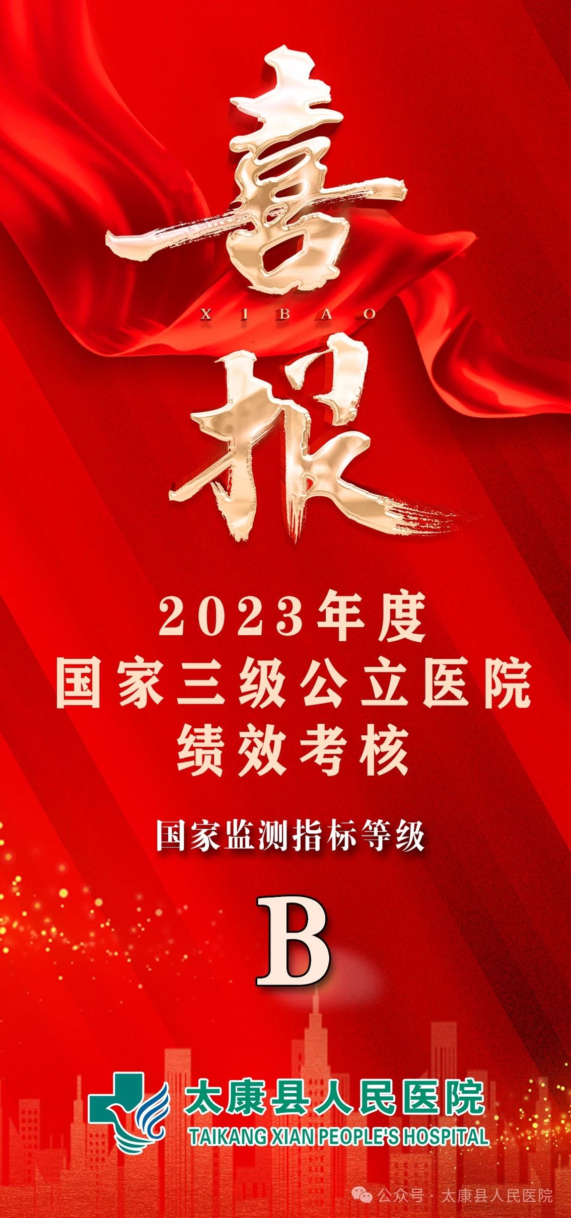 近日,国家卫生健康委正式公布2023年度三级公立医院绩效考核结果,太康县人民医院实现了从C+(2022年),连升两级,至B级(2023年)的跨越式提升!这是医院全体职工勠力同心、砥砺奋进的成果,更是对我院高质量发展的强力印证!