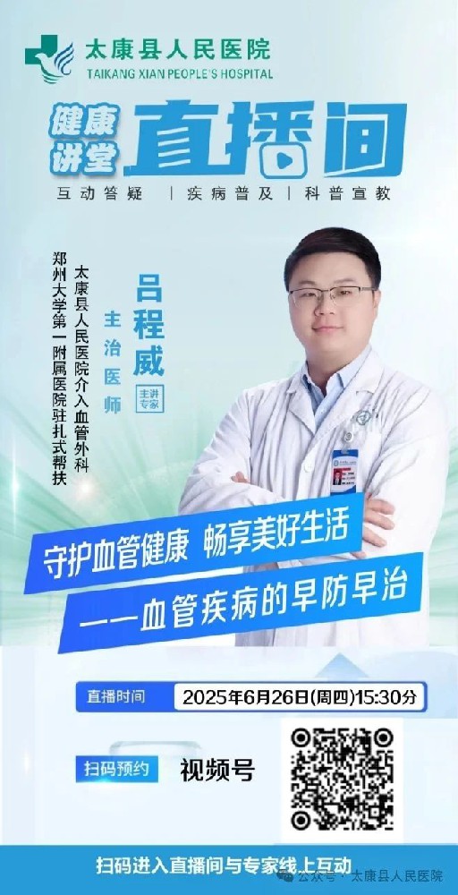 6月26日(本周四)15:30,郑州大学第一附属医院驻扎式帮扶太康县人民医院介入血管外科主治医师吕程威将做客太康县人民医院健康讲堂直播间。