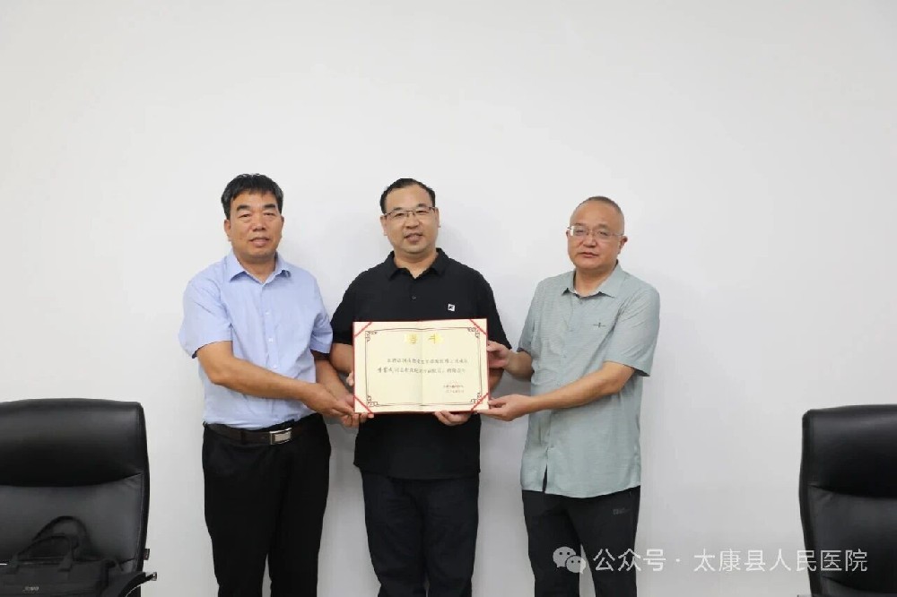太康县委组织部副部长程敬伟宣读了《关于做好2025年省派博士服务员到岗安置工作的通知》并与太康县人民医院院长张向东共同为李富成教授颁发了名誉证书,标志着李富成博士正式成为我院名誉副院长。