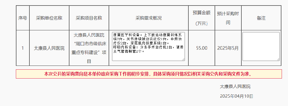 为便于供应商及时了解政府采购信息,根据《河南省财政厅关于开展政府采购意向公开工作的通知》(豫财购〔2020〕8号)等有关规定,现将太康县人民医院 2025年4(至)5月采购意向公开如下: