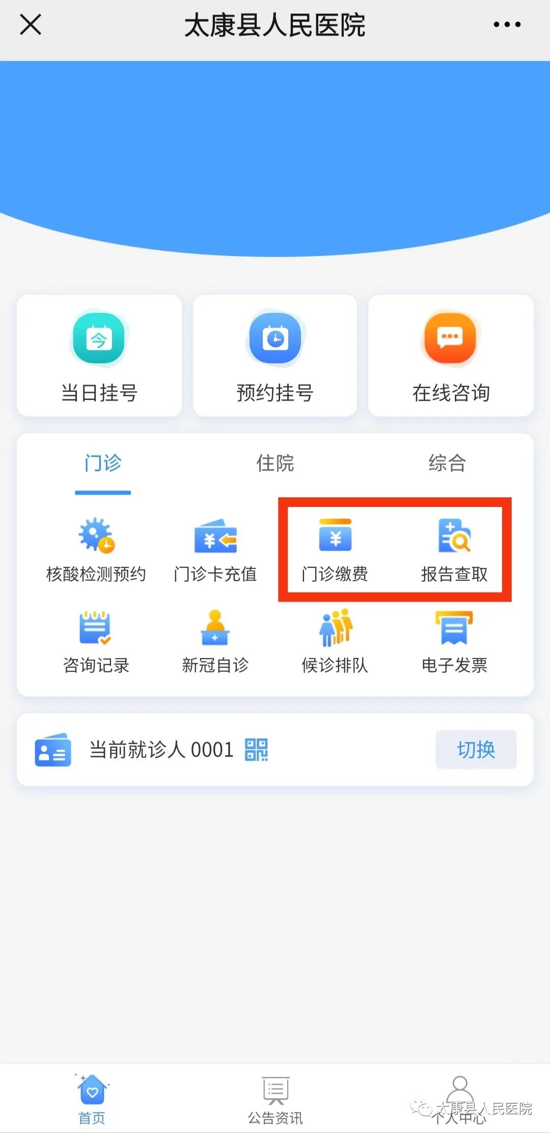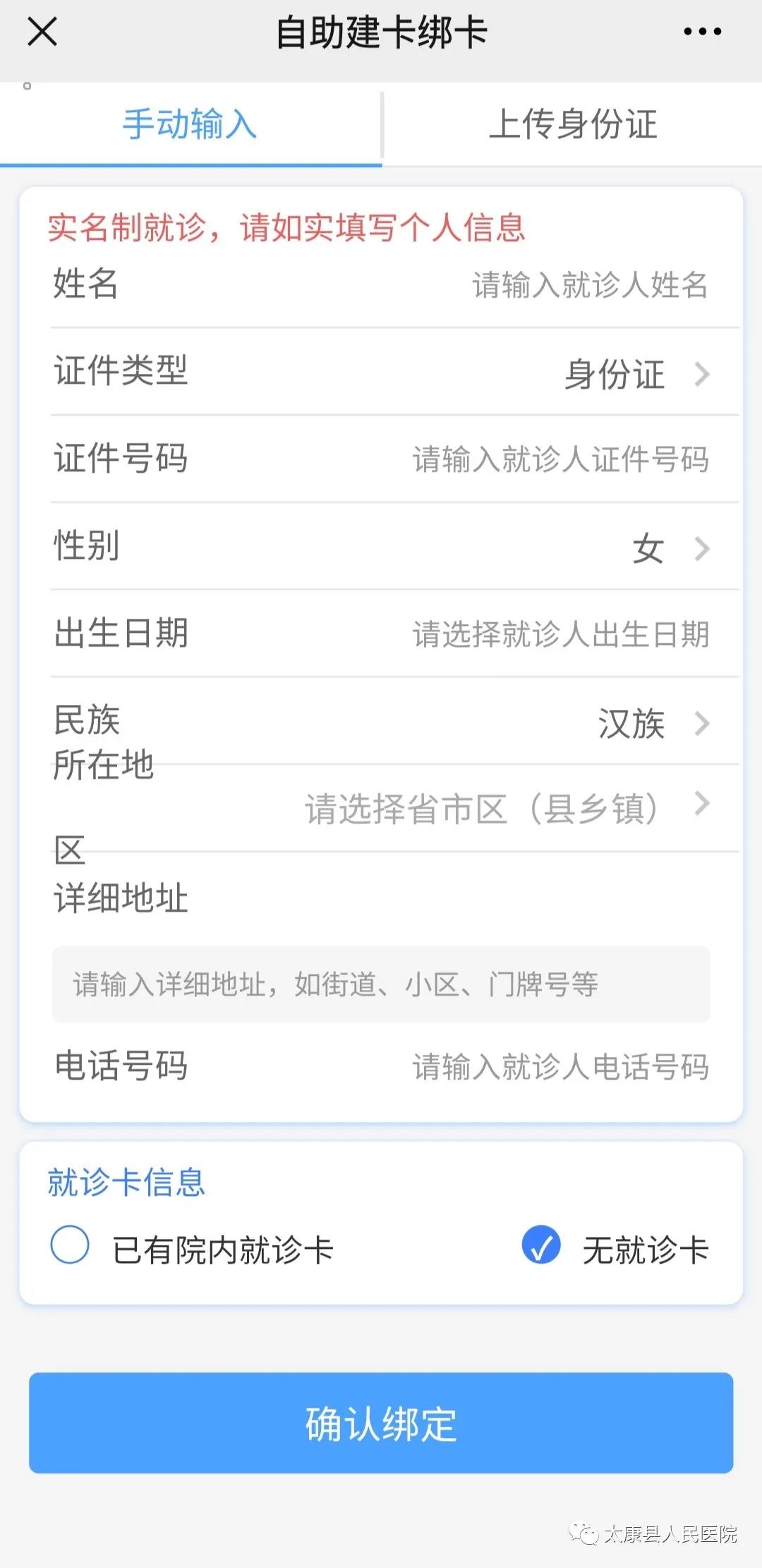 微信关注太康人民医院服务号,点击诊疗服务就诊首页,点击“立即绑定”,初次使用请输入就诊人信息