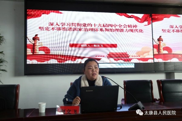 为深入学习宣传贯彻党的十九届四中全会精神。12月27日下午,太康县人民医院召开学习党的十九届四中全会精神专题报告会。会议邀请太康县委党校讲师赵文飞来院授课。院领导班子、各临床科室主任、护士长、职能科室科长及全体党员参加会议。陈敬副院长主持会议。