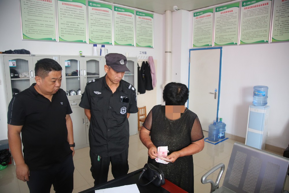 崔女士与保卫科科科长常红磊及保安王锦立共同确认钱款,并核实无误。