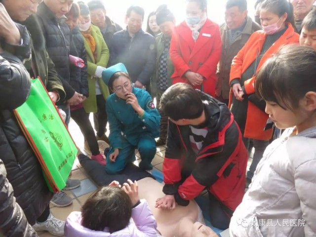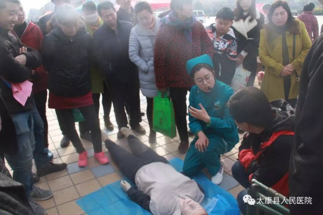 我院120急救站护士在义诊现场演示胸外心脏按压模拟操作并讲解相关急救知识。
