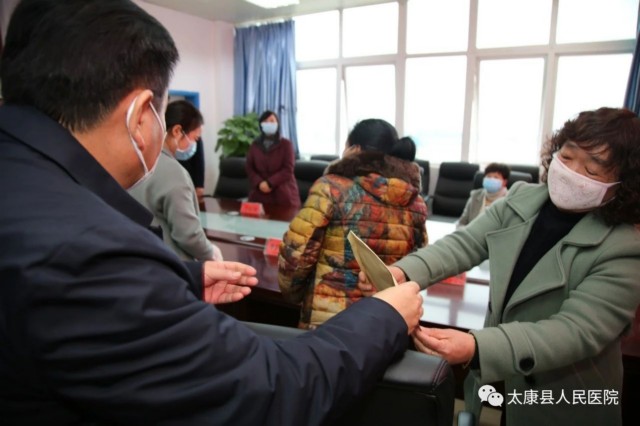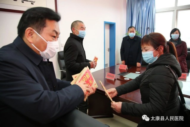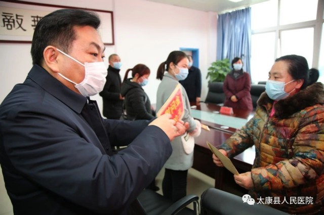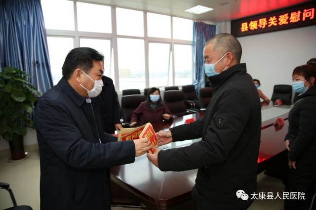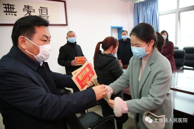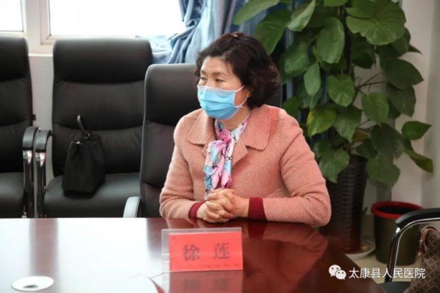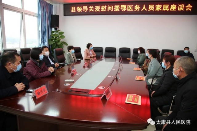 2月28日下午, 太康县县委书记王国玺,县委办公室主任张雪芳,副县长司春荣、卫健委主任徐莲莅临我院看望慰问驰援武汉疫情防控一线的5位援鄂医疗队队员家人。我院党委书记、院长聂方华带领班子成员陪同慰问。卫健委主任徐莲主持座谈会。