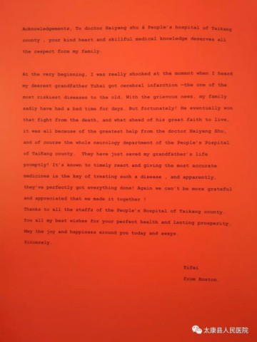 经过小编后续采访得知,寄来感谢信的是老人在美国麻省理工上学的孙子,原稿是用英文书写。经过老人的重新润色并复印了40份,准备亲自送往我院各个科室以表达感激之情。我院工作人员得知情况后,担心老人毕竟已是80岁高龄,与老人沟通后同意由我院工作人员代为转发。附感谢信原稿及翻译:
