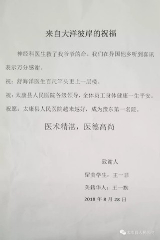 感谢太康县人民医院和舒海洋医生,您善良的心和娴熟的医学知识值得我家人的尊敬。