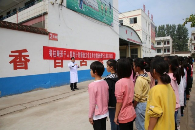 河南省“脊柱健康校园行”活动开始,领导和专家们来到毛庄一中,对在校学生及教师进行脊柱健康科普讲座及颈腰椎健康运动操推广,并对300名学生进行脊柱侧弯筛查。