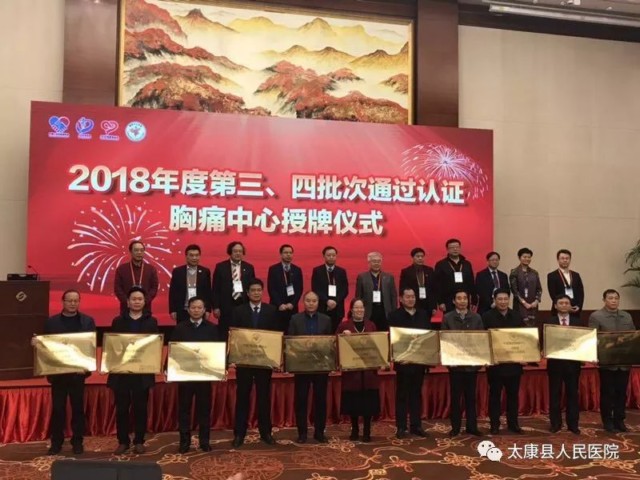 12月28日,中国胸痛中心2018年度第三、四批次授牌仪式在苏州举行。会上,中国胸痛中心总部授予我院“中国基层胸痛中心”,是对我院胸痛中心建设工作的充分肯定,更是胸痛中心团队共同努力的成果。我院将进一步提升急性心肌梗死整体预防和救治水平,在急性心肌梗死诊疗行为、急性心肌梗死、主动脉夹层、肺动脉栓塞等急性胸痛相关疾病的诊疗水平上,加速向规范化、系统化、流程化、标准化迈进,为全县人民的身体健康保驾护航。