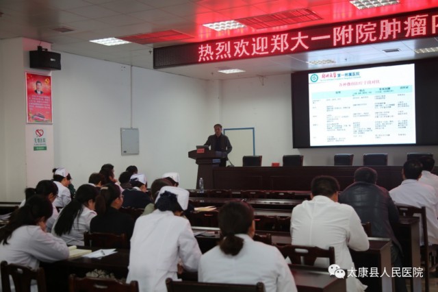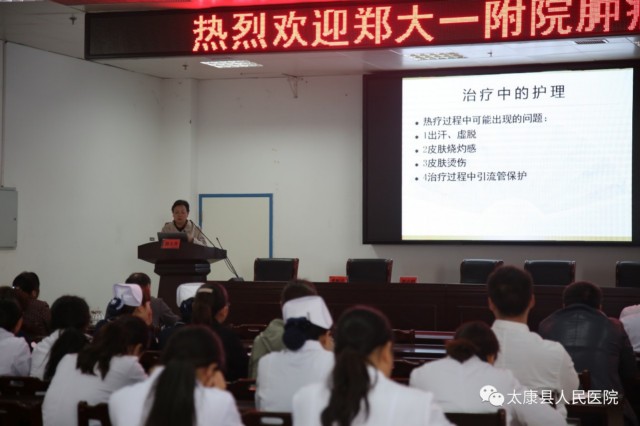 3月28日下午,郑州大学第一附属医院肿瘤科主任路太英教授,放射科、 影像与核医学病区主任周志刚教授莅临我院授课培训,课题分别为:《肿瘤热疗》《体腔热循环灌注化疗机理及应用技巧》《肺癌微创治疗之消融决策的选择》,我院肿瘤内外科、普外科、胸外科、介入科、放疗科等相关科主任、护士长及科室医生参加了此次培训,会议由医政科副科长、科教科科长冯华伟主持。