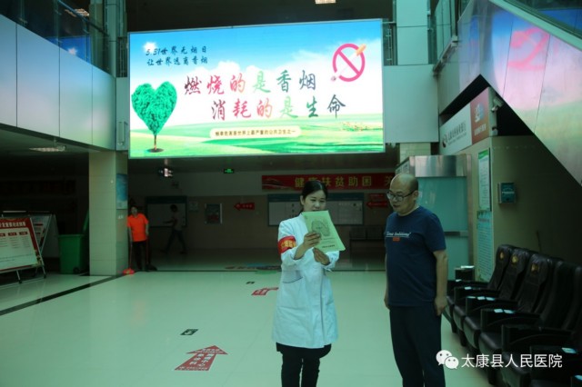 在人民医院南院区,医务人员和安保人员也担当起控烟巡查员,为吸烟者和被动吸烟者提供烟草危害知识讲解及戒烟指导,此次义诊活动共累计义诊300余人、检测血压200余人、血糖100余人、健康教育宣传资料900余份,受到现场群众的一致好评。