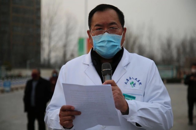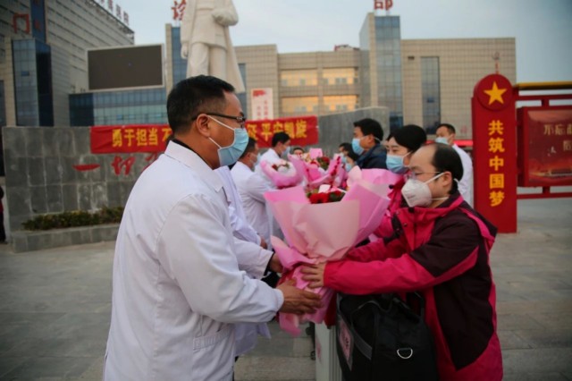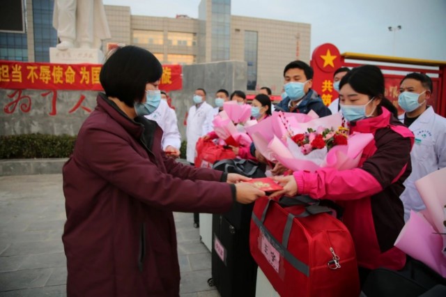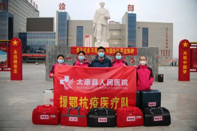 “'逆向而行、出征湖北',你们的选择,令人动容!生命重于泰山,疫情就是命令,防控就是责任。接到上级支援任务后,我院迅速吹响集结号,短短30分钟内你们积极响应号召,主动接受召唤组成这支医疗队。希望全体出征队员要牢记白衣天使的初心和使命,全身心投入到救治工作中。每位队员要做好自身防护,防止交叉感染,切实做到安安全全。要注重团队协作,以高度的责任感和使命感,因地制宜开展救治工作,应对好各种突发状况。在那没有硝烟的战场,你们要充分展现太医人的精神风貌,每个人都成为一面旗帜。太康县人民医院是你们医疗队的坚强后盾,愿你们此去顺利,我们期待你们凯旋!”