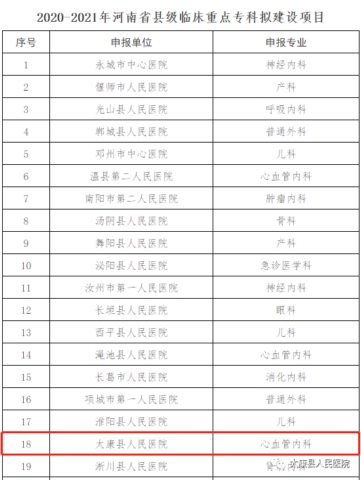6月13日,河南省卫生健康委员会公布了2020-2021年河南省县级临床重点专科拟建设项目名单,我院心血管内科以优异的成绩被评为2020年河南省县级临床重点专科。同时,也充分证明了我院心血管内科的综合实力、诊治服务水平,管理能力、科研教学等都达到了较高的水平,得到了省各级领导及专家的认可。至此,我院已有神经内科、神经外科、儿科、心血管内科4个临床专科跻身河南省县级临床重点专科行列。