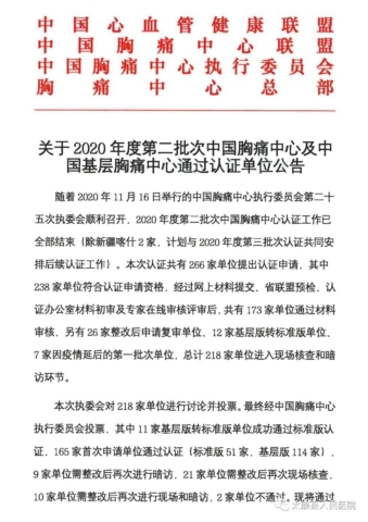 2018年12月14日我院荣获中国胸痛中心认证工作委员会投票一致通过,成为2018年第四批中国胸痛中心及中国基层胸痛中心认证单位。