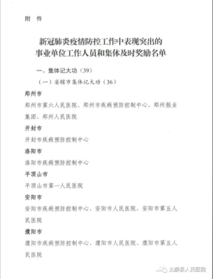 为鼓舞士气、表扬先进、弘扬正气,激励广大事业单位工作人员担当作为、干事创业,根据中共河南省委组织部、河南省人力资源和社会保障厅《关于做好新冠肺炎疫情防控工作中表现突出的事业单位工作人员和集体及时奖励工作的通知》(豫人社办〔2020〕42号)要求,按照单位推荐、主管部门、省辖市事业单位人事综合管理部门审核上报、网上公示等程序,经研究决定,对省辖市36个集体、175名个人记大功,对省直3个集体、27名个人记大功,8个集体、460名个人记功,133个集体、3169名个人嘉奖。