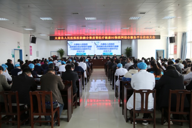 我院党委书记、院长聂方华致辞:“我院牢记公立医院的使命与担当,牵头7家乡镇单位和223个村卫生室,顺利推动县乡村一体化建设。以点对点技术诊疗帮扶、远程会诊、远程心电、远程影像中心建设为重点,建成区域内大型远程会诊中心,成绩有目共睹。今天,我们作为试点单位在河南省率先启动的“医疗健康5G物联网综合服务平台,是我们紧跟健康中国战略发展规划,积极落实分级诊疗制度,推进太康县医防融合建设的新探索,更是我们太康县人民医院立足解决群众就医难题,为基层患者谋福利的新举措。希望我们太康人民医院的干部职工及全体村医牢固树立大卫生、大健康理念,以强烈的改革担当精神,高质量全面推进县域医共体建设,努力推动太康县卫生健康事业走进全省前列,共同努力为我们太康县160万人民群众的健康保驾护航。”