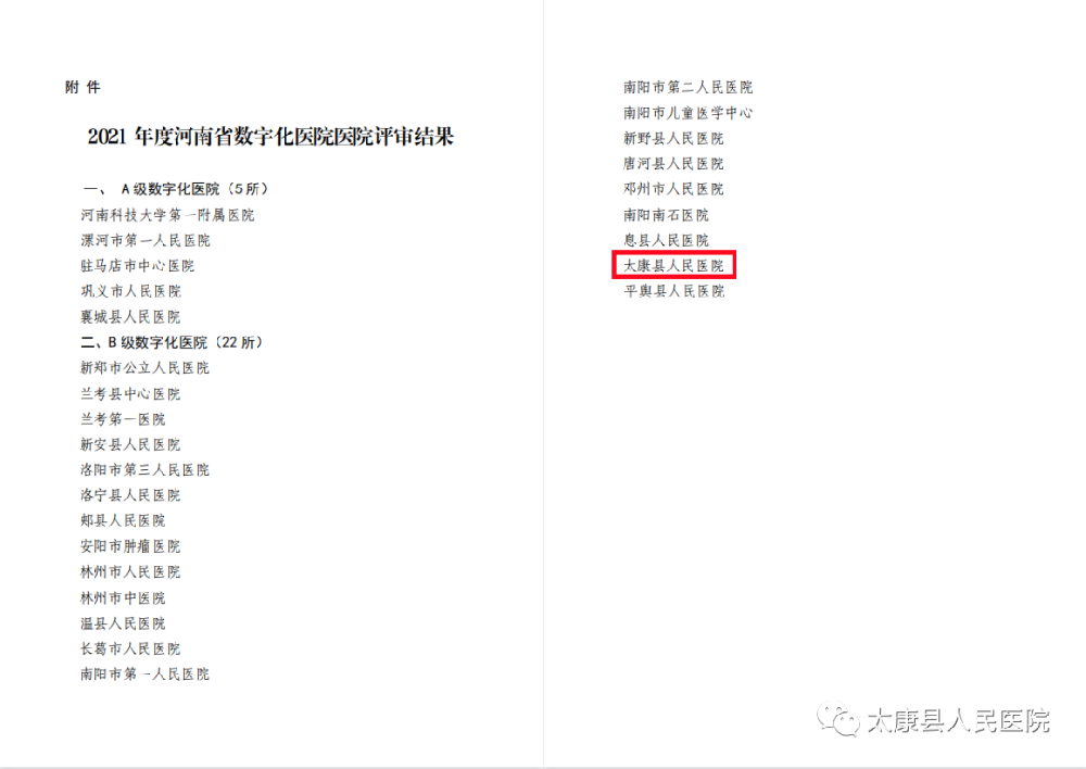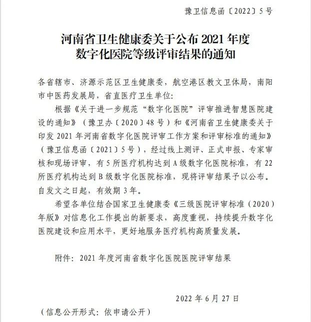按照评审结果通知,河南省共有 5 所医疗机构达到 A 级数字化医院标准,有 22所医疗机构达到 B 级数字化医院标准,我院被评为B级数字化医院,评审有效期为3年。
