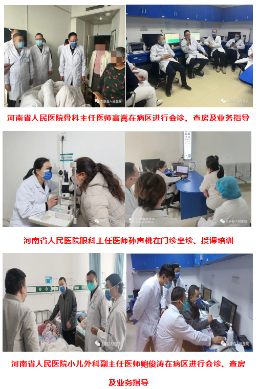 为充分发挥互联智慧分级诊疗优势,进一步推动优质医疗资源下沉共享,2022年3月3日上午,由河南省人民医院公共事业发展部主任贺会玲、骨科主任医师高嵩、眼科主任医师孙声桃、小儿外科副主任医师鲍俊涛、耳鼻喉科主治医师李倩组成的河南省人民医院百县百家百场“中原情·中原行”专家志愿服务团走进我院,在我院开展会诊、坐诊、查房、授课培训、业务指导等系列帮扶活动。