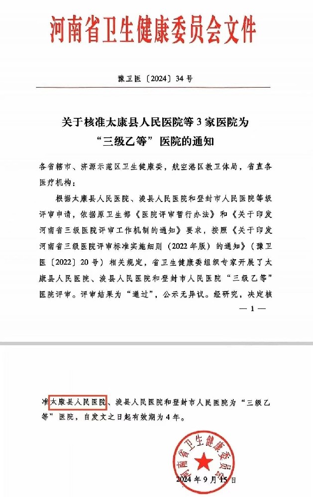 9月15日,河南省卫健委发布了《关于核准太康县人民医院等3家医院为“三级乙等”医院的通知》,太康县人民医院顺利通过三级乙等医院评审,成为周口市首家县级三级乙等医院。太医人多年的夙愿终于实现历史性跨越,更是标志着医院高质量发展驶入快车道。