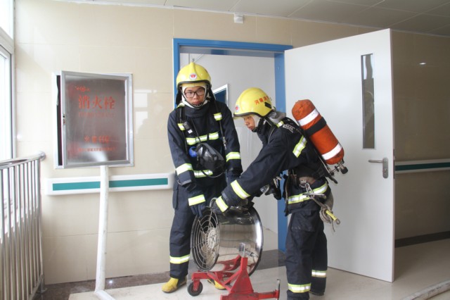 排烟组2人抬排烟机从南侧安全出口进场排烟降温。