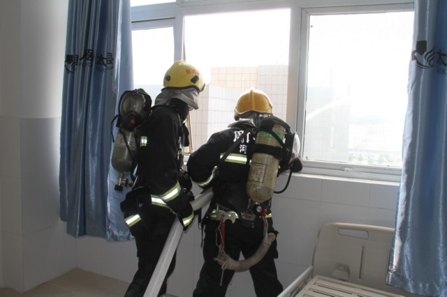 演练模拟情景为我院病房楼5楼西南某病房,由于电气线路短路起火,瞬间引燃了室内可燃物品,形成稳定燃烧,火势迅速蔓延。